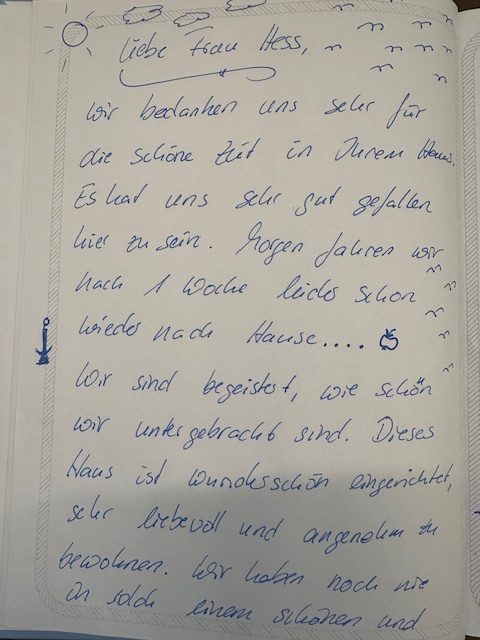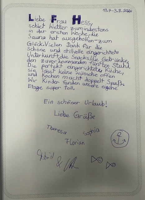 Wir freuen uns darauf, euch bald begrüßen zu dürfen – und vielleicht taucht euer persönlicher Erfahrungsbericht dann schon bald als neuer Eintrag in unserem Gästebuch auf, mit dem ihr andere Gäste inspiriert und ihnen zeigt, wie schön, erholsam und unvergesslich ein Urlaub im Landhaus Seewind sein kann.