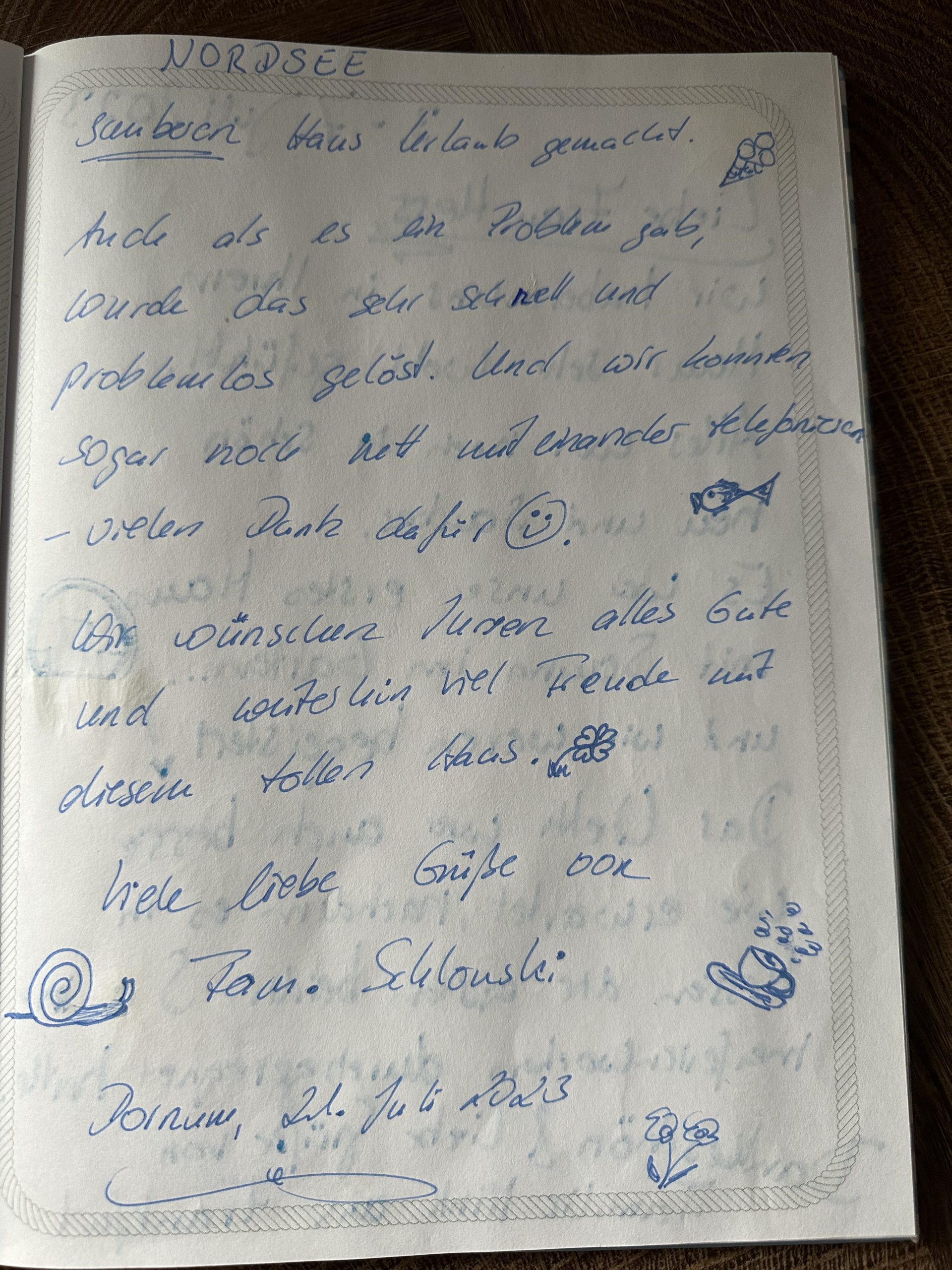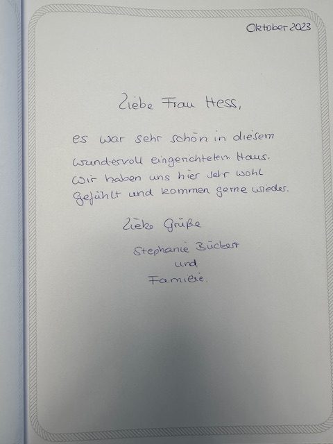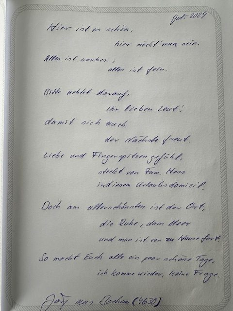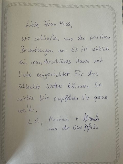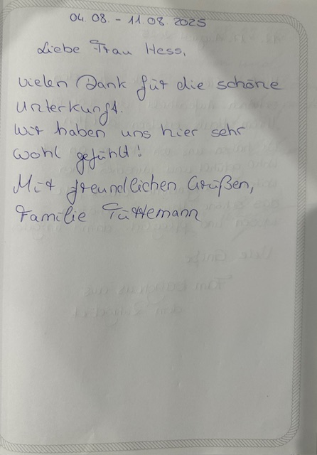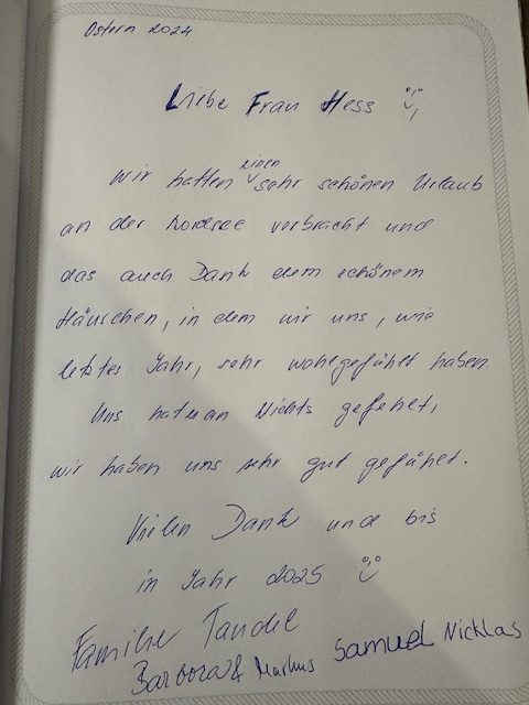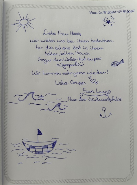 Unser Gästebuch lebt von euren Erfahrungen und eurer persönlichen Sicht auf den Urlaub im Landhaus Seewind. Wenn ihr bereits bei uns in Dornum (Ostfriesland) zu Gast wart, freuen wir uns, wenn ihr euch einen Moment Zeit nehmt und einen Eintrag hinterlasst.