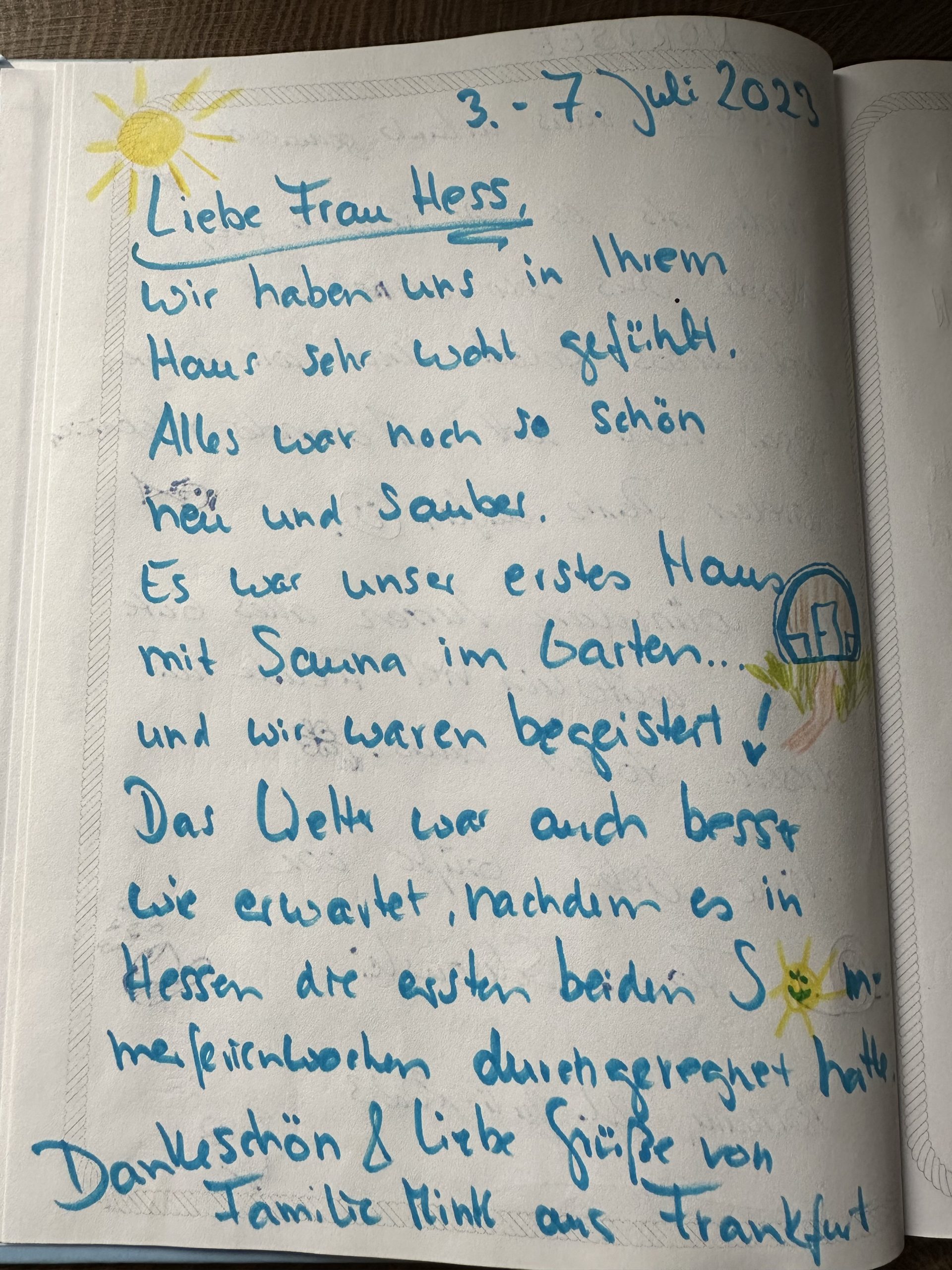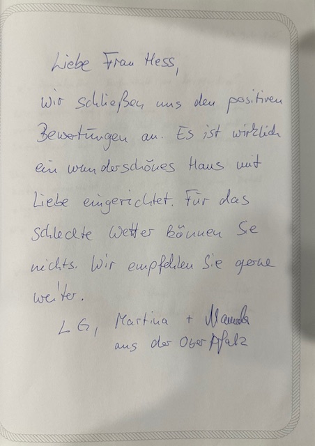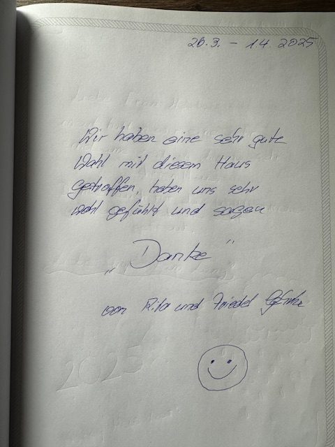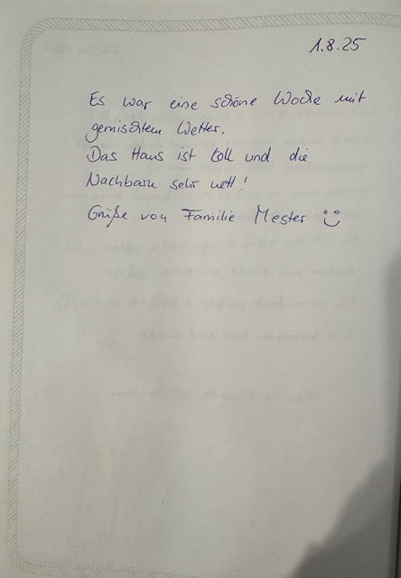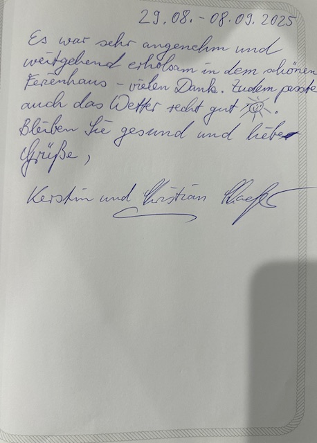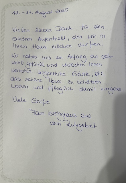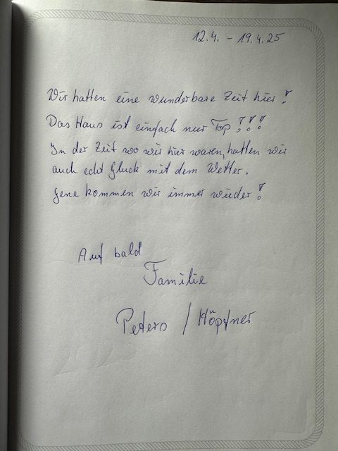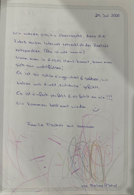 Eure persönlichen Berichte im Gästebuch helfen anderen Interessenten, sich ein realistisches Bild vom Urlaub im Ferienhaus zu machen – und sie geben uns gleichzeitig wertvolles Feedback, damit wir euren Aufenthalt weiterhin so angenehm, entspannt und komfortabel wie möglich gestalten können.