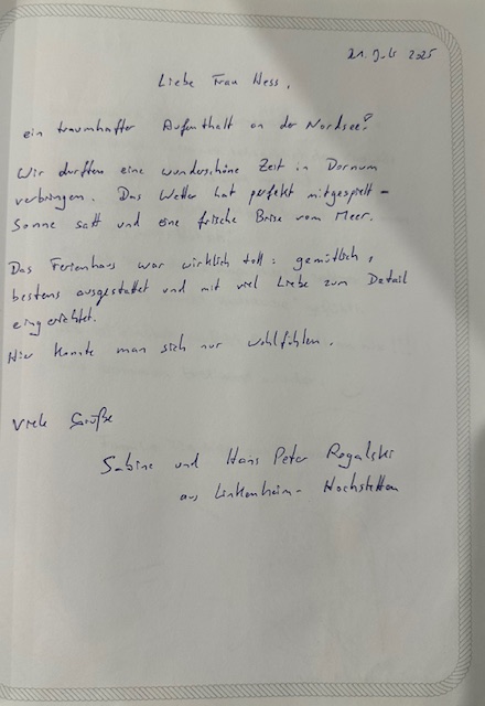 Erzählt kurz, was euch besonders gut gefallen hat, welche Ausflüge ihr unternommen habt und welche Momente euch in Erinnerung geblieben sind. Ob Spaziergang durch Dornum, Radtour in der Umgebung, Strandtag in Dornumersiel, ein gemütlicher Abend auf der Terrasse oder euer Lieblingsplatz im Haus – jede Rückmeldung hilft anderen Gästen weiter.